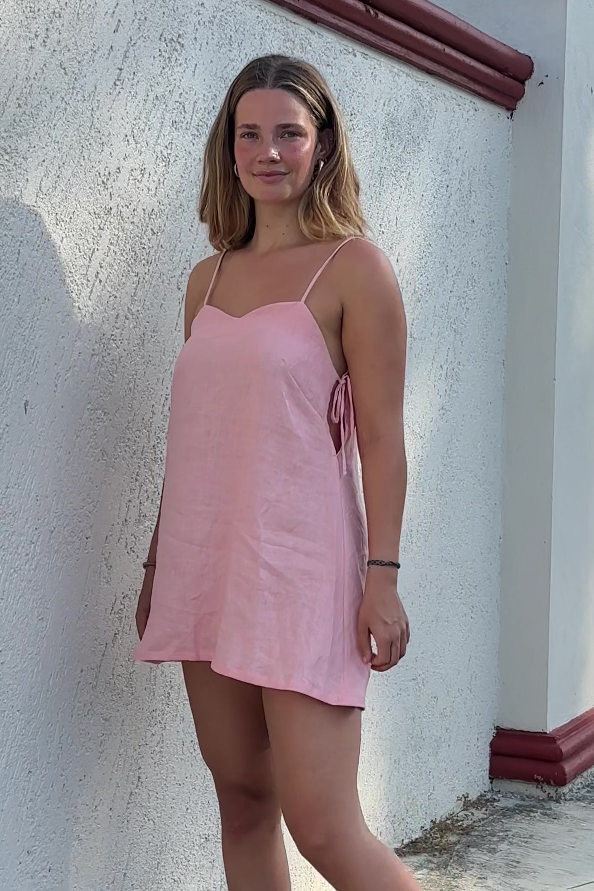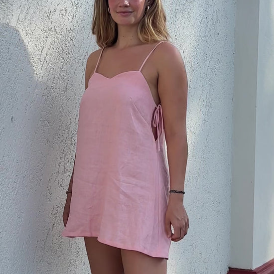 The Gina Dress is a lightweight, short summer dress crafted from 100% linen, ensuring breathable comfort during warm days. It features adjustable shoulder and side straps, allowing a personalized fit that enhances ease of movement. The design includes frontal darts for subtle shaping and a gently scooped back hem that extends 1½ inches, providing elegant back coverage while maintaining a casual, breezy silhouette. Thoughtfully made with local craftsmanship, this dress combines natural fabric quality with a flattering, relaxed fit ideal for effortless summer style.