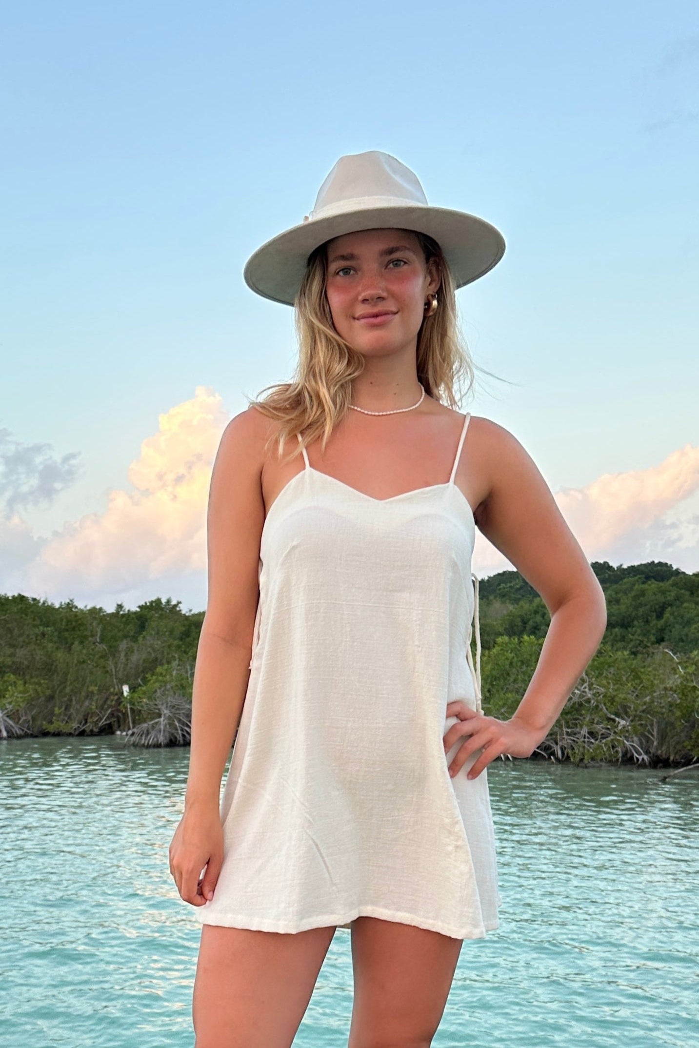 The Gina Dress is a breezy, lightweight summer essential made entirely from breathable cotton to keep you cool and comfortable. Adjustable shoulder and side straps offer a customizable fit that moves with you, while subtle front darts shape the silhouette gracefully. Its softly scooped back hem, extending 1½ inches, adds an elegant touch without sacrificing a relaxed, casual vibe. Crafted with care by local artisans, this dress blends natural fabric with flattering design for an effortlessly stylish warm-weather look.